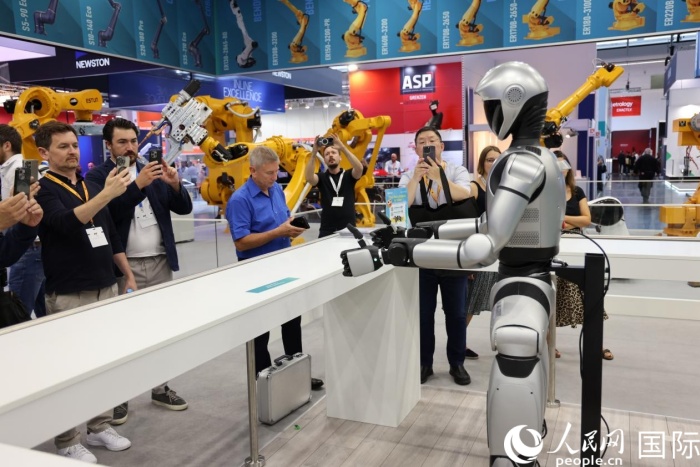 埃斯頓的(de)人(rén)形機(jī)器(qì)人(ré$©n)吸引展商參觀拍(pāi)攝。人(rén)民(mín)網記者 劉仲華攝